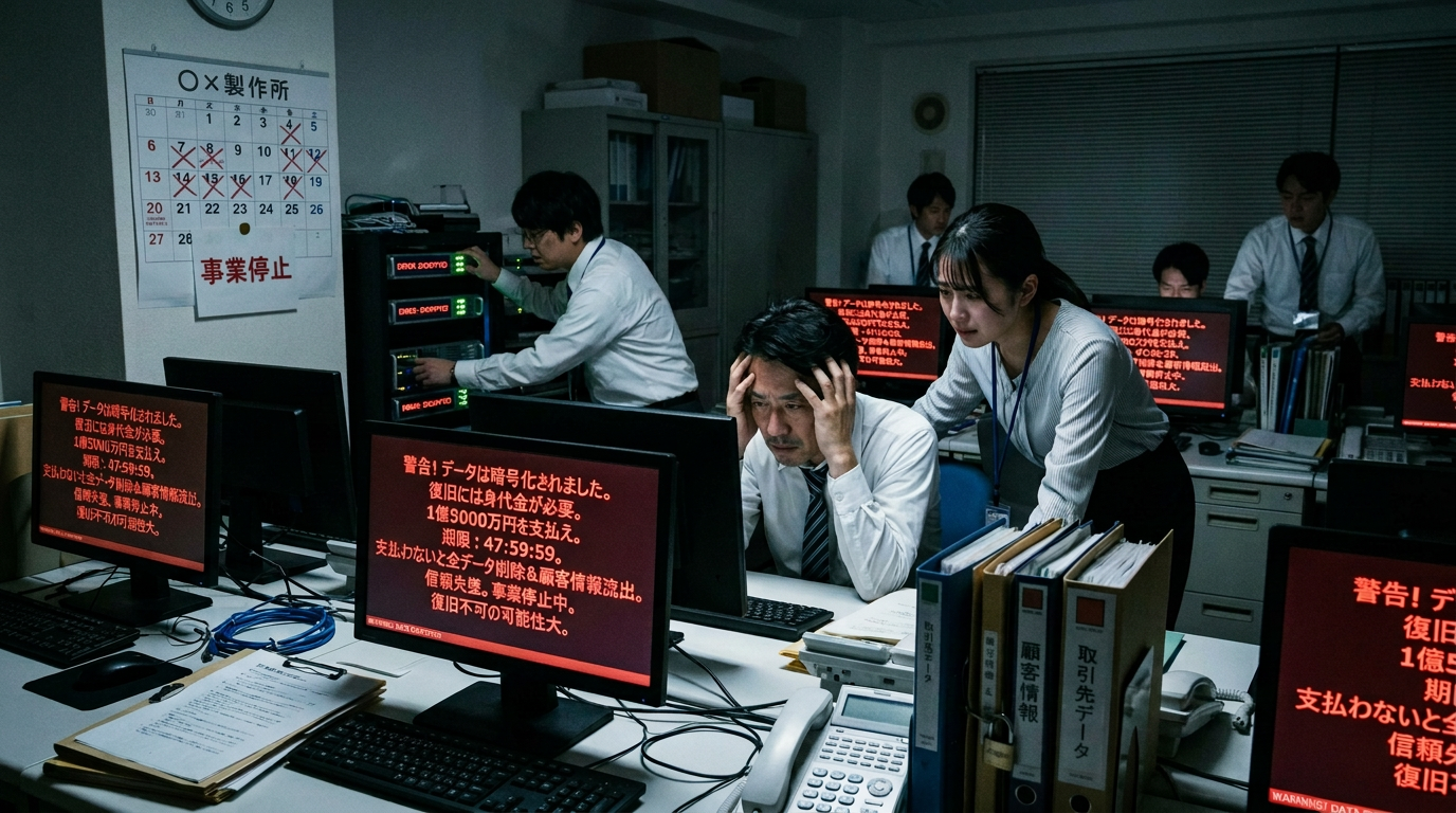 受注も出荷も請求もできず。顧客からクレームが殺到。 身代金5,000万円を要求 される。取引先への納品遅延で違約金発生。