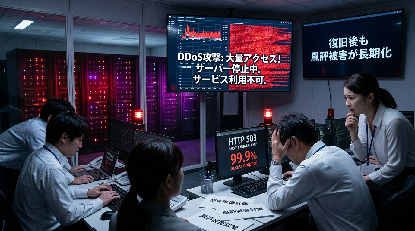 大量アクセスでサーバーをダウンさせ、 業務を完全停止 。ECサイトは直接的な売上損失。復旧後も風評被害が長期化。